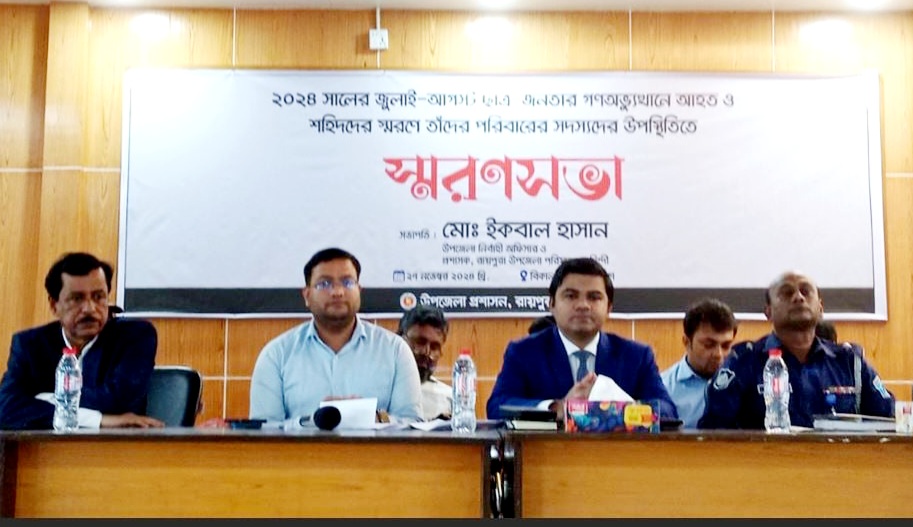 রায়পুরা (নরসিংদী) প্রতিনিধি : নরসিংদীর রায়পুরায় বুধবার (২৭নভেম্বর) বিকেলে উপজেলা প্রশাসনের আয়োজনে ছাত্র-জনতার গণঅভ্যুত্থানে আহত ও নিহতদের স্মরণে তাদের পরিবারের সদস্যদের উপস্থিতিতে স্মরণ সভা ও দোয়া মাহফিল অনুষ্ঠিত হয়েছে।