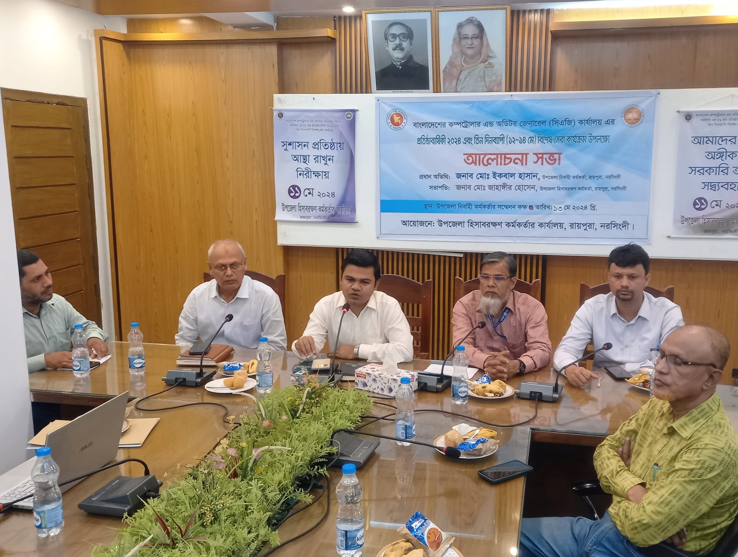 রায়পুরা (নরসিংদী) প্রতিনিধি : বাংলাদেশের কম্পট্রোলার এন্ড অডিটর জেনারেল (সিএজি) কার্যালয় এর প্রতিষ্ঠাবার্ষিকী ২০২৪ এবং তিনদিন ব্যাপী (১২-১৪ মে) বিশেষ সেবা কার্যক্রম উপলক্ষে আলোচনা সভা অনুষ্ঠিত হয়েছে। সোমবার (১৩ মে) সকালে উপজেলা পরিষদ সভাকক্ষে রায়পুরা উপজেলা হিসাবরক্ষন কর্মকর্তা মো. জাহাঙ্গীর হোসেনের সভাপতিত্বে প্রধান অতিথি হিসেবে উপস্থিত ছিলেন রায়পুরা উপজেলা নির্বাহী অফিসার মো. ইকবাল হাসান। এসময় উপস্থিত ছিলেন উপজেলা প্রকৌশলী মো. মাজেদুল হক সজীব, নরসিংদী সরকারি টেকনিক্যাল স্কুল এন্ড কলেজের অধ্যক্ষ হাসিনা বেগম, আদিয়াবাদ ইসলামিয়া স্কুল এন্ড কলেজের অধ্যক্ষ নুর সাখাওয়াত হোসেন, উপজেলা সিনিয়র মৎস্য কর্মকর্তা মো. হাবীব ফরহাদ আলম, উপজেলা যুব উন্নয়ন কর্মকর্তা মো. জাকির হোসেন মোল্লা, উপজেলা পরিসংখ্যান কর্মকর্তা মো. আল আমিন, মহিলা বিষয়ক কর্মকর্তা ফাতেমা আক্তার, উপজেলা সমবায় কর্মকর্তা রৌশনারা বেগম, রায়পুরা প্রেসক্লাবের সভাপতি এম নূরউদ্দিন, রায়পুরা সাংবাদিক ফোরামের সভাপতি মেহেদী হাসান রিপন, উপজেলা রিপোর্টাস ক্লাবের সভাপতি মো. মনিরুজ্জামান প্রমুখ।