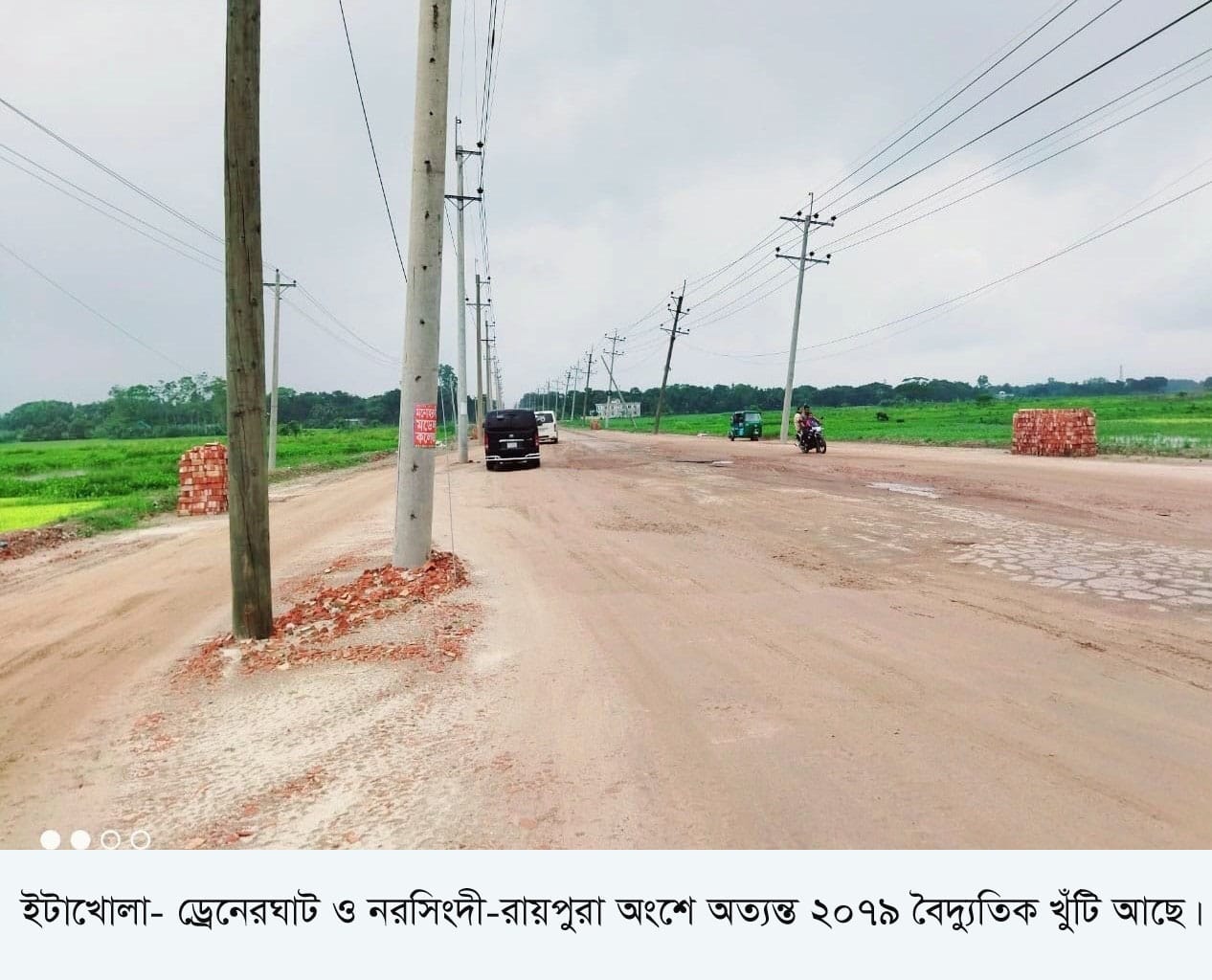 তবে, এসব অভিযোগ কিছুটা স্বীকারও করেছেন নরসিংদী পল্লী বিদ্যুৎ সমিতি-২ এর জেনারেল ম্যানেজার শেখ মানোয়ার মোরশেদ । তিনি বলেন, টাকা জমা দিয়েছেন ঠিক আছে,টাকা পেয়েছি কাজ ও চলমান আছে। ধীরে হলে ও খুঁটি সরানোর কাজ চলছে। এক্সেন সাহেবেরে ডিজাইন অনুসারে কোনটা কোনটা জরুরী কাজ এইটা আমরা করে যাচ্ছি। মালামাল ক্রয় করতে হয়। সংগ্রহ করতে হয়। এটারও একটা নিয়ম আছে। মালামাল সংগ্রহ করছি,ঠিকাদার দিয়েছি তারা কাজ করছে। আশা করি আগামী ছয় মাসের মধ্যে শেষ হয়ে যাবে। তবে প্রকল্প সংশ্লিষ্ট ও ঠিকাদারি প্রতিষ্ঠান বলছে, সড়ক থেকে খুঁটি সরানোর বিষয়ে প্রায় দুই বছর আগে থেকে অনেক চিঠি দেওয়া হয়েছে। বৈঠকে বসা হয়েছে একাধিকবার। চাহিদা মত একবছর আগে লাইন স্থানান্তর ও পুণ:নির্মাণের টাকাও পরিশোধ করা হয়েছে। এতেও কাজ হচ্ছে না। এ খুঁটি সরছে না। জানা যায়, ২০২২ সালের ১৯ জুলাই নরসিংদী সড়ক বিভাগের আত্ততায় ইটাখোলা-মঠখোলা-কটিয়াদী সড়ক (আর-২১১) ও নয়াপাড়া-আড়াইহাজার-নরসিংদী-রায়পুরা (আর-১১৪) দুইটি আঞ্চলিক মহাসড়ক যথাযথ মানে প্রশস্ততায় উন্নতিকরণ প্রকল্প একনেক সভায় অনুমোদিত হয়। জিওবির অর্থায়নে ৫৪.৮০ কিলোমিটার সড়ক উন্নয়নে প্রকল্পটির মোট ব্যায় ধরা হয় ৯৮৪.৮৪৭২ কোটি টাকা। প্রকল্পটির অনুমোদতি মেয়াদ ১ জুলাই ২০২২ থেকে ৩০ জুন ২০২৫ পর্যন্ত। প্রকল্পে সড়ক দুটি ৪টি প্যাকেজে ভাগ করে চারটি অংশে পৃথক দরপত্র আহ্বান করা হয়। সড়ক গুলো চওড়া হবে ৩৪ ফুট। সড়কের গুরত্বপূর্ণ স্থান গুলোতে একাধিক আন্ডারপাস,ওভারপার,সাইড রোড, সেতু ও ড্রেন নির্মাণ করা হবে। এর মধ্যে ইটাখোলা-মঠখোলা-কটিয়াদী আঞ্চলিক (আর-২১১) সড়কটি দুইটি প্যাকেজে ভাগ করা হয়।