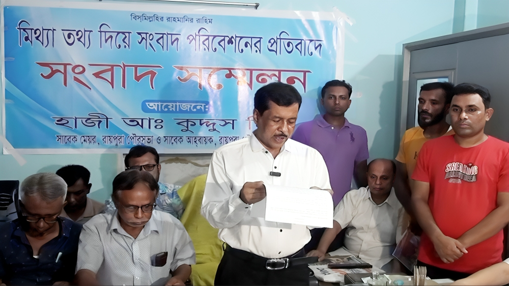 মিথ্যা তথ্যদিয়ে সংবাদ পরিবেশন করে সংবাদ প্রকাশের প্রতিবাদে পাল্টা সংবাদ সম্মেলন করেছেন নরসিংদীর রায়পুরা পৌরসভার সাবেক মেয়র হাজী আবদুল কুদ্দুছ মিয়া।