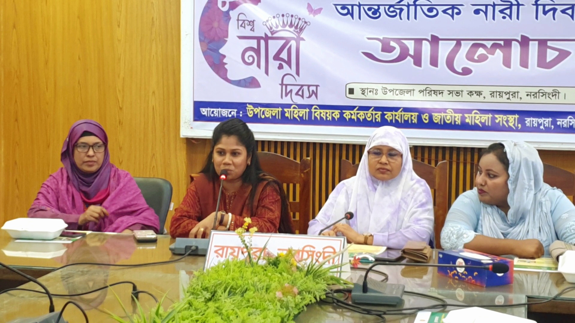 রায়পুরা (নরসিংদী) প্রতিনিধি: "আজকের পদক্ষেপ, আগামীর ন্যায় বিচার, সুরক্ষিত হোক নারী ও কন্যার অধিকার " এই প্রতিপাদ্যকে সামনে রেখে আন্তর্জাতিক নারী দিবস উপলক্ষে নরসিংদীর রায়পুরায় এক আলোচনা সভা অনুষ্ঠিত হয়েছে।
