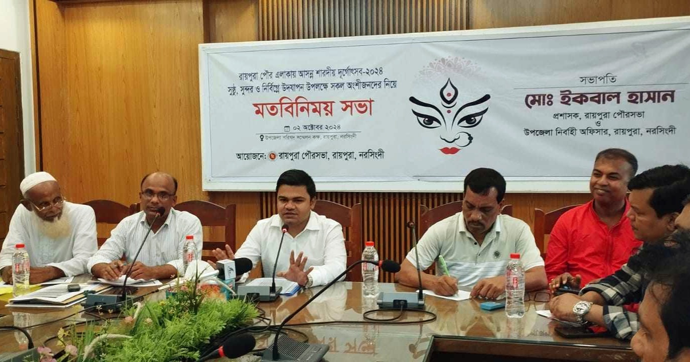 নিজস্ব প্রতিবেদক : নরসিংদীর রায়পুরা পৌরসভার আয়োজনে পৌরসভা পূজা উদযাপন পরিষদ ও পৌর এলাকার পূজা মণ্ডপের নেতৃবৃন্দদের নিয়ে মত বিনিময় সভা অনুষ্ঠিত হয়েছে। বুধবার (২ সেপ্টেম্বর) বিকেলে উপজেলা পরিষদের হল রুমে এ সভা অনুষ্ঠিত হয়। সভায় সভাপতিত্ব করেন, উপজেলা নির্বাহী কর্মকর্তা ও রায়পুরা পৌর প্রশাসক মো. ইকবাল হাসান। এসময় সহকারী কমিশনার (ভূমি) শফিকুল ইসলাম, পৌরসভার সচিব মো. মনিরুল ইসলাম, উপজেলা বিএনপি’র ভারপ্রাপ্ত সভাপতি হযরত আলী ভূইয়া, বাংলাদেশ পূজা উদযাপন পরিষদ রায়পুরা উপজেলা শাখার সভাপতি এডভোকেট চন্দন কান্তি সাহা, পৌরসভা বিএনপির সাধারণ সম্পাদক সাইফুল ইসলাম পলাশ, উপজেলা পূজা উদযাপন পরিষদের সাধারণ সম্পাদক তাপস কুমার বিশ্বাস, সহ সভাপতি শংকর মেম্বার, পৌরসভা পূজা উদযাপন পরিষদের সভাপতি বিজয় পাল, উপজেলা বাংলাদেশ জামায়েত ইসলামী’র আইন বিষয়ক সম্পাদক সাহেদুল আলম, রায়পুরা প্রেসক্লাবের সাধারণ সম্পাদক মো. রফিকুল হক, সাংবাদিক ফোরামের সভাপতি মো. মেহেদী হাসান রিপন, বাংলাদেশ জামায়েত ইসলামী, বৈষম্য বিরোধী ছাত্র আন্দোলনের রায়পুরা শাখার সমন্বয়ক বৃন্দ, বিভিন্ন রাজনৈতিক সংগঠনের নেতৃবৃন্দ উপস্থিত ছিলেন। এসময় পৌর প্রশাসকের দায়িত্বে থাকা উপজেলা নির্বাহী কর্মকর্তা মো. ইকবাল হাসান, রায়পুরায় হিন্দু ধর্মালম্বীদের সবচেয়ে বড় উৎসব শারদীয় দূর্গা পূজাকে সুষ্ঠু ও শান্তিপূর্ণ ভাবে পালনের ক্ষেত্রে সকলের সহযোগিতা একান্তভাবে কামনা করেন।