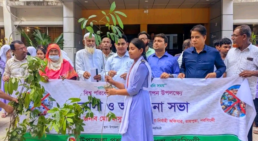 নরসিংদীর রায়পুরায় “প্লাস্টিক দূষণ রোধে এখনই কার্যকর পদক্ষেপ গ্রহণ করুন” এই প্রতিপাদ্যকে সামনে রেখে বিশ্ব পরিবেশ দিবস-২০২৫ উপলক্ষে র্যালি ও আলোচনা সভা অনুষ্ঠিত হয়েছে।