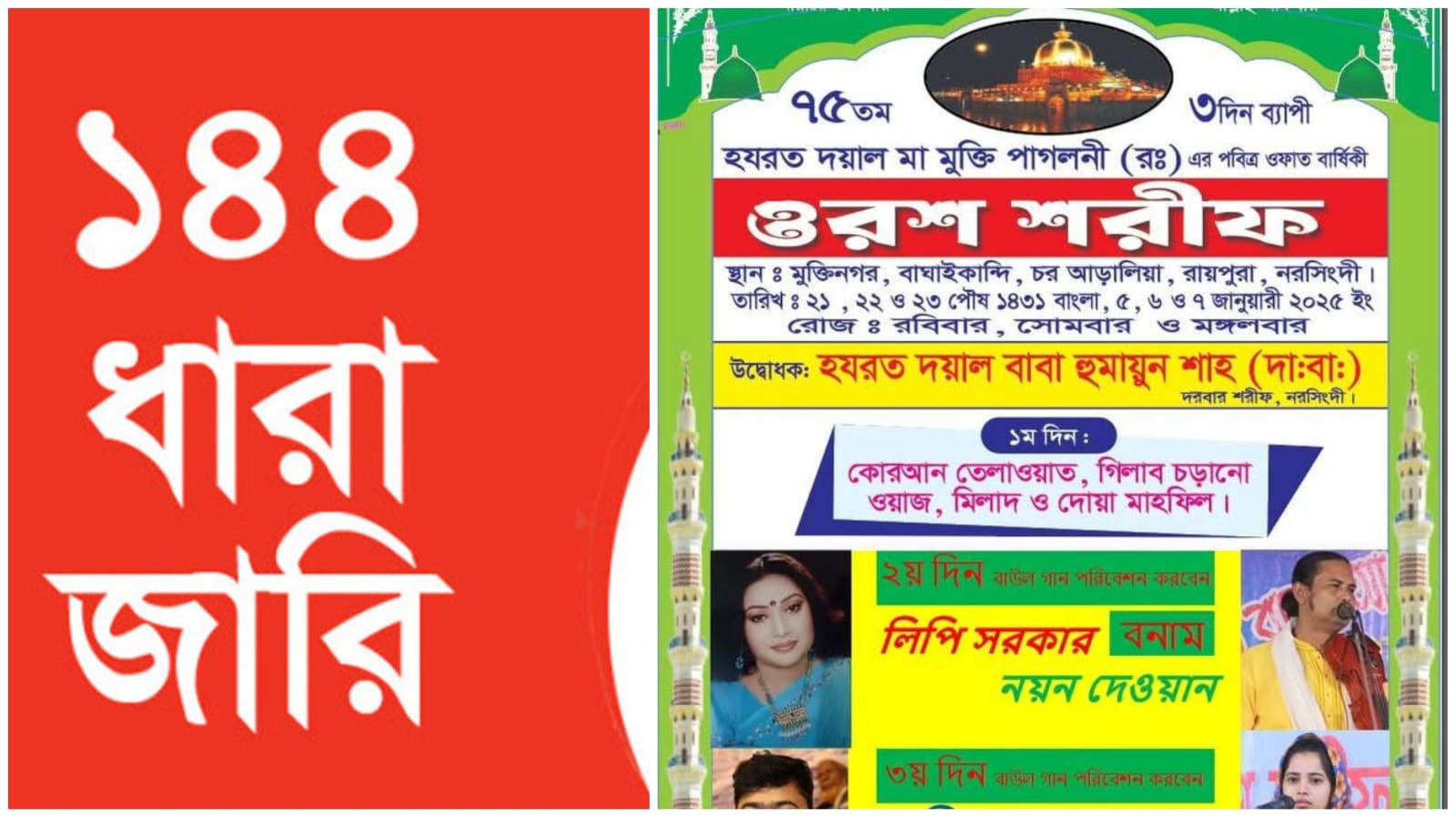 নরসিংদীর রায়পুরা উপজেলার চরআড়ালিয়া ইউনিয়নের বাঘাইকান্দি এলাকায় ৭৫ বছর যাবত অনুষ্ঠিত হয়ে যাওয়া মুক্তি পাগলীর মাজারের তিনদিন ব্যাপী ওরশকে কেন্দ্র করে আয়োজক কমিটি ও ওলামায়ে কেরামগনের মধ্যে দুটি গ্রুপ তৈরী হওয়ায় আইনশৃঙ্খলা অবনতি, রক্তক্ষয়ী সংঘর্ষ ও ব্যাপক প্রাণহানীর আশঙ্কায় ১৪৪ ধারা জারি করেছে নরসিংদী জেলা প্রশাসন।
