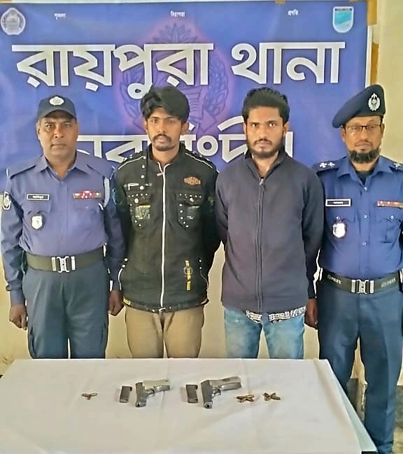 নরসিংদীর রায়পুরায় দুইটি বিদেশি পিস্তল এগারো রাউন্ড গুলি ও দুইটি ম্যাগজিনসহ দু্ই যুবককে গ্রেপ্তার করেছে রায়পুরা থানার পুলিশ।