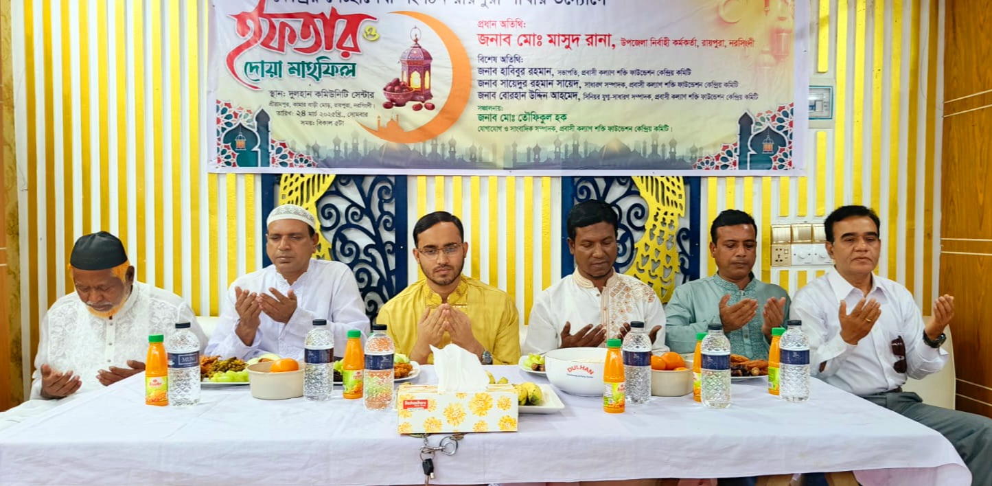 নরসিংদী রায়পুরায় প্রবাসী কল্যাণ শক্তি ফাউন্ডেশন এর উদ্যোগে ইফতার ও দোয়া মাহফিল অনুষ্ঠিত হয়েছে।