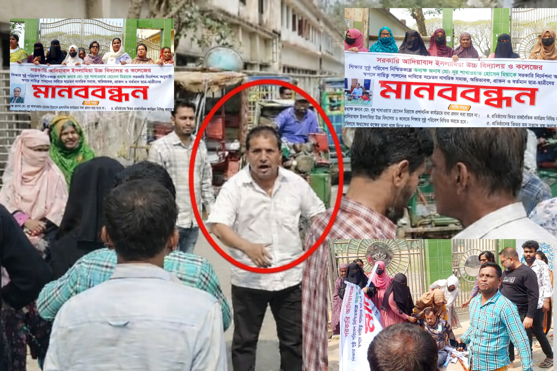 বৃহস্পতিবার (২৬ জানুয়ারি) দুপুরে প্রতিষ্ঠানটির প্রধান ফটকে আয়োজিত মানববন্ধনে এলাকার নাগরিক সমাজ, অভিভাবক এবং প্রাক্তন ও বর্তমান শিক্ষার্থীরা অংশ নেন। আয়োজকদের অভিযোগ, আদিয়াবাদ ইউনিয়ন বিএনপির সাধারণ সম্পাদক বাদল মিয়া ও তার অনুসারীরা মানববন্ধনে বাধা দেন। এর আগে বিদ্যালয় মাঠে কর্মসূচি পালনের চেষ্টা করলে নারীদের উদ্দেশে অশালীন মন্তব্য করে তাদের সেখান থেকে সরিয়ে দেওয়া হয় বলেও অভিযোগ করা হয়।