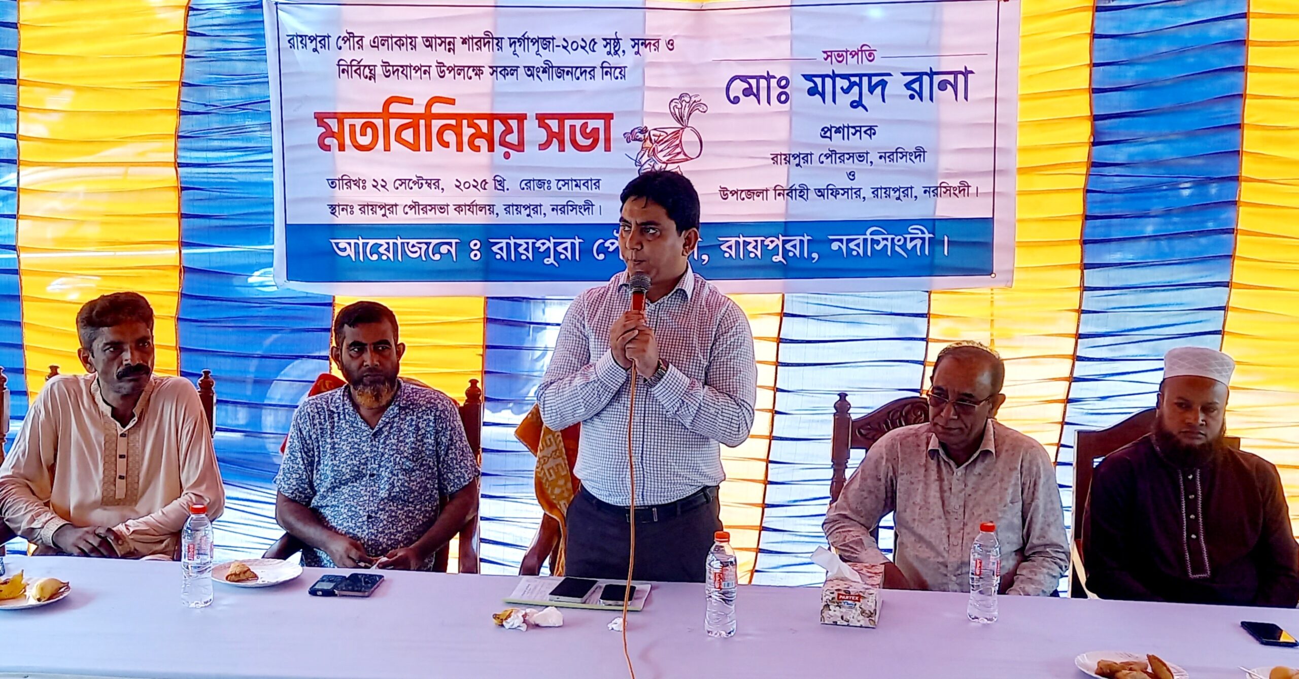 উল্লেখ্য, রায়পুরা পৌরসভায় মোট (২২)টি পূজামণ্ডপে এ বছর দুর্গাপূজা অনুষ্ঠিত হবে। পূজা শুরুর দিন থেকে বিজয়া দশমী পর্যন্ত প্রতিটি মণ্ডপে প্রশাসনের পক্ষ থেকে সার্বক্ষণিক নজরদারি নিশ্চিত করার আশ্বাস দেওয়া হয়।