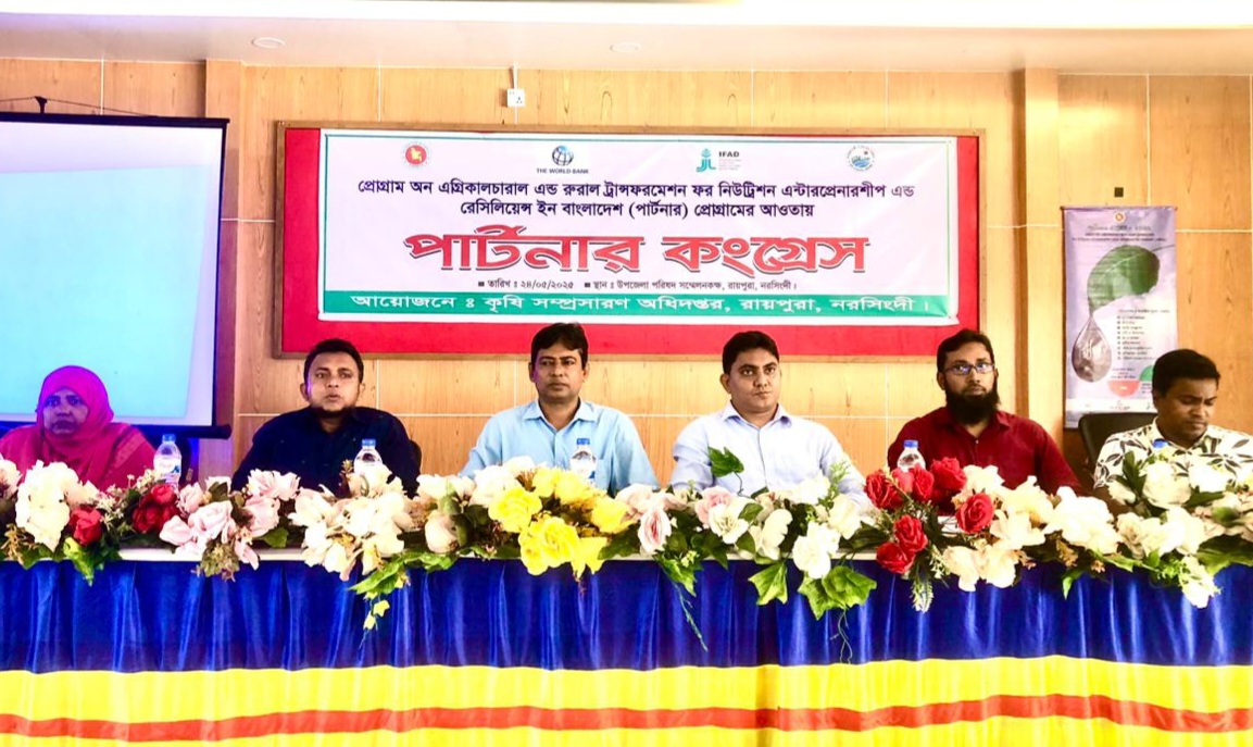রায়পুরা (নরসিংদী) প্রতিনিধি: নরসিংদীর রায়পুরায় কৃষকদের নিয়ে "পার্টনার কংগ্রেস" (কৃষক সমাবেশ) অনুষ্ঠিত হয়েছে। শনিবার (২৪ মে) দুপুরে প্রোগ্রাম অন এগ্রিকালচারাল এন্ড রুরাল ট্রান্সফরমেশন ফর নিউট্রিশন এন্টারপ্রেনারশীপ এন্ড রেসিলিয়েন্স ইন বাংলাদেশ (পার্টনার) প্রোগ্রামের আওতায় শতাধিক কৃষক -কৃষাণীদের নিয়ে এ "পার্টনার কংগ্রেস" অনুষ্ঠিত হয়।