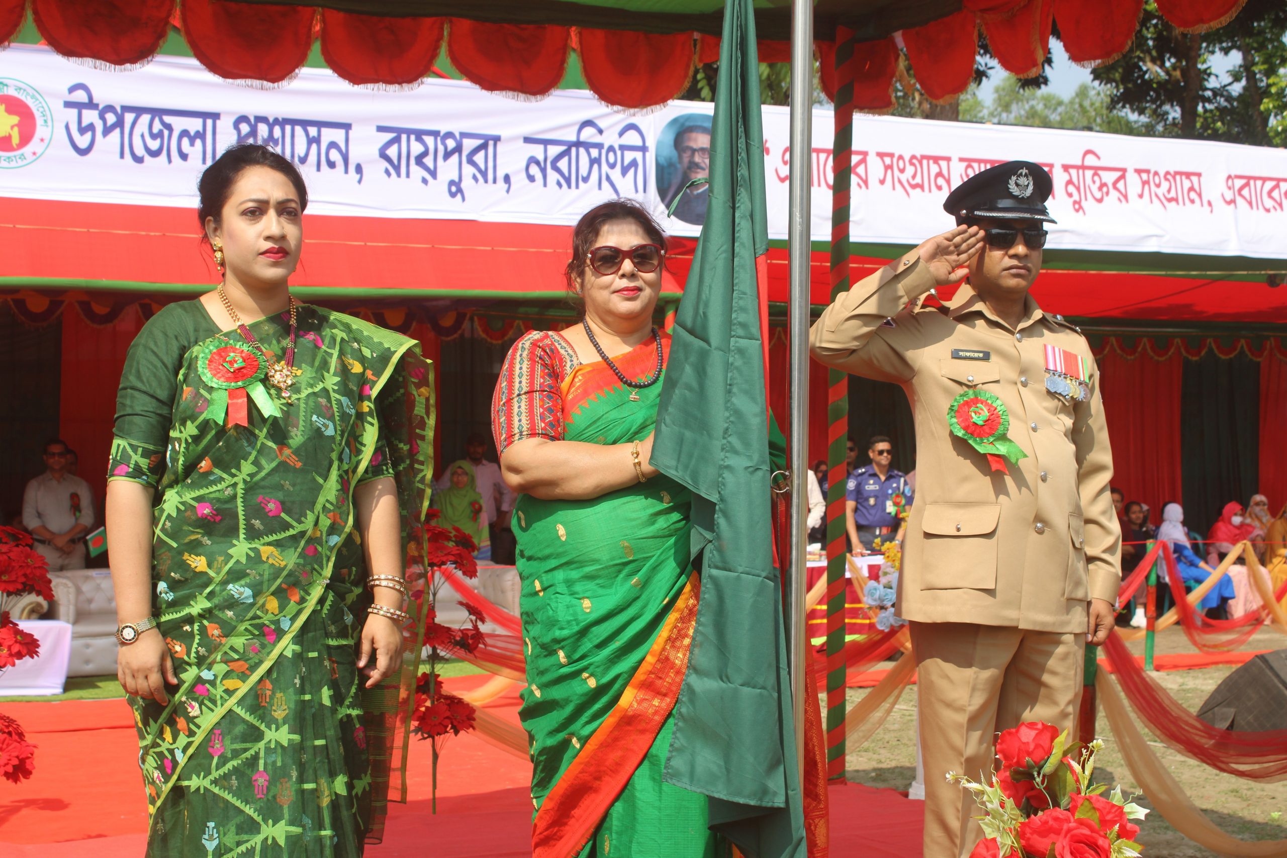 নরসিংদীর রায়পুরায় যথাযোগ্য মর্যাদায় উদযাপন করা হয়েছে মহান স্বাধীনতা ও জাতীয় দিবস। উপজেলা প্রশাসনের নির্ধারিত সময়সূচী অনুযায়ী প্রত্যুষে ৩১বার তোপধ্বনির মাধ্যমে মহান স্বাধীনতা ও জাতীয় দিবসের শুভ সূচনা হয়। পরে সুর্য্যদয়ের সাথে সাথে জাতীয় পতাকা উত্তোলন করে সকল সরকারী-বেসরকারী প্রতিষ্ঠান। সকাল ৮টায় উপজেলা কেন্দ্রীয় শহীদ মিনারে পুস্পস্তবক অর্পণ করেন উপজেলা নির্বাহী কর্মকর্তা রোজলীন শহীদ চৌধুরী, উপজেলা পরিষদের চেয়ারম্যান লায়লা কানিজ লাকি, সহকারী কমিশনার (ভূমি) শফিকুল ইসলাম, পৌর মেয়র জামাল মোল্লা, রায়পুরা থানার ওসি সাফায়েত হোসেন পলাশ, উপজেলা পরিষদের ভাইস চেয়ারম্যান তাহমিনা মানিক, উপজেলা আওয়ামীলীগের সভাপতি বীর মুক্তিযোদ্ধা আফজাল হোসাইন, উপজেলা মুক্তিযোদ্ধা সংসদের সাবেক কমান্ডার মো. নজরুল ইসলাম, রায়পুরা প্রেসক্লাবের সভাপতি এম নূরউদ্দিন আহমেদ, প্রকল্প বাস্তবায়ন কর্মকর্তা প্রকৌশলী মো. বোরহান উদ্দিন, সাংবাদিক ফোরামের সভাপতি মেহেদী হাসান রিপন, রিপোর্টাস ক্লাবের সভাপতি মনিরুজ্জামান মনিরসহ উপজেলা আওয়ামীলীগ ও সহযোগী সংগঠন সহ বিভিন্ন প্রতিষ্ঠানের পক্ষ হইতে শহীদ মিনারে পুস্পস্তবক অর্পণ করা হয়। পরে রায়পুরা প্রেসক্লাব সংলগ্ন রেললাইনের পাশে গণকবর ও স্বাধীনতা যুদ্ধে শহীদ মুক্তিযোদ্ধাগণের কবরে পুষ্পস্তবক অর্পণ শেষে বিশেষ মোনাজাত করা হয়। সকাল ৯ টায় রায়পুরা কলেজ মাঠে আনুষ্ঠানিকভাবে জাতীয় পতাকা উত্তোলন এবং প্যারেড ও কুচকাওয়াজে সালাম গ্রহন করেন উপজেলা নির্বাহী অফিসার রোজলীন শহীদ চৌধুরী, উপজেলা পরিষদের চেয়ারম্যান লায়লা কানিজ লাকি, সহকারী কমিশনার (ভূমি) শফিকুল ইসলাম ও অফিসার ইনচার্জ সাফায়েত হোসেন পলাশ প্রমূখ। পরে ডিসপ্লে উপস্থাপনে বিভিন্ন শিক্ষা প্রতিষ্ঠান থেকে অংশ গ্রহনকারী বিজয়ীদের হাতে পুরস্কার তুলে দেন অতিথিবৃনদ।