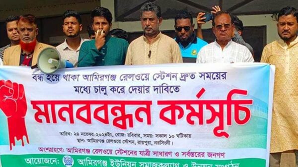 রায়পুরার আমিরগঞ্জ রেলওয়ে স্টেশন চালুর দাবিতে মানববন্ধন