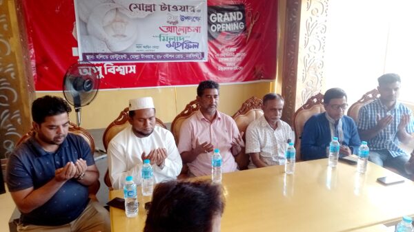 এম নূরউদ্দিন আহমেদ :  নরসিংদী রেলওয়েস্টেশন রোডস্থ “মোল্লা টাওয়ার”-এর এক বছর পূর্তি উপলক্ষে এক আলোচনা সভা, মিলাদ ও দোয়া মাহফিলের আয়োজন করা হয়েছে। রবিবার (২৭ অক্টোবর) বিকেলে “মোল্লা টাওয়ার” এর